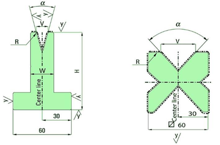 一般情況下標準角度的下模需要與相應角度的上模組成一套彎曲工具( Press Brake Tooling)才能發揮器下模最大的生產效益,目前方威可為客戶提供 90°, 88度,60°, 30°的上模(下模)。