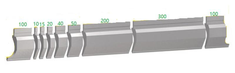 我們可以根據客戶的要求將下模(下模)進行分段,比如長度為835mm的下模可以分為8段(10mm, 15mm, 20mm, 40mm, 50mm, 200mm, 400mm),也可以作為一整套提供